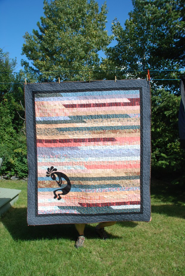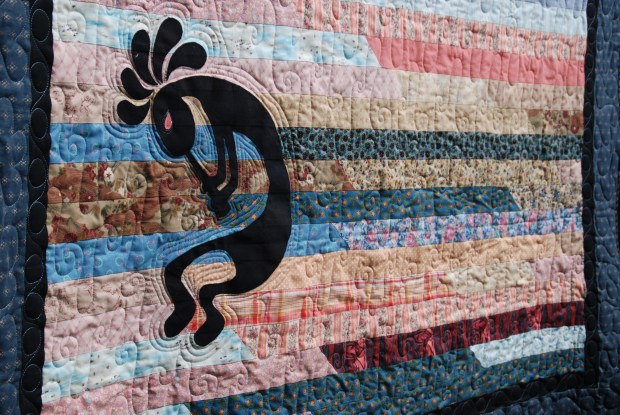 Kokopelli is the Hopi deity of fertility (childbirth and agriculture) and a trickster who represents the spirit of music. This quilt features Kokopelli in his common representation playing a flute.