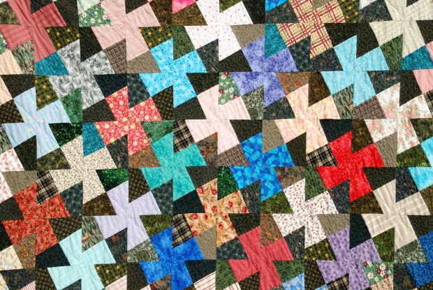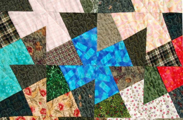 The light block in this quilt pop against a mixed dark background, with a custom quilting stitch across the dark colours to unify them.